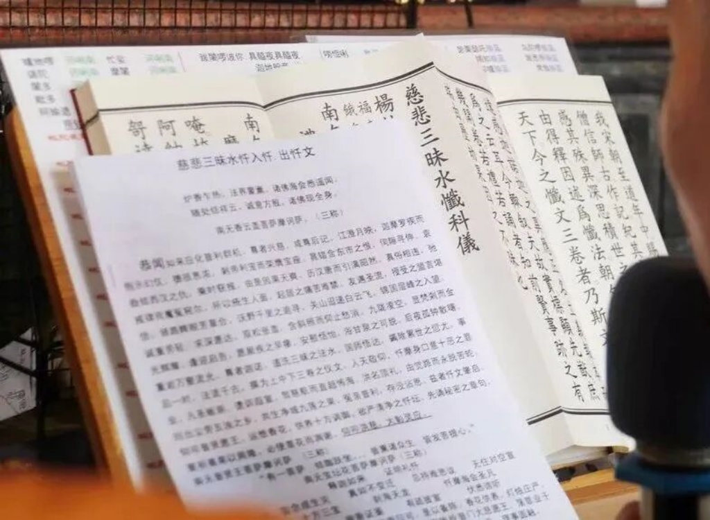 中国佛教的忏法起源于晋代,渐盛于南朝,流行于唐代。现在通行的有梁皇忏、慈悲水忏、大悲忏、药师忏、净土忏、地藏忏等。其中,慈悲水忏最具有代表性。